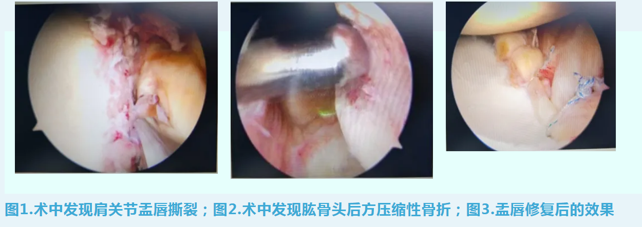 科室團隊針對患者的病情,最終確定實施“關(guān)節(jié)鏡下盂唇損傷修補+肱骨頭岡下肌腱填塞術(shù)”。經(jīng)過周密的術(shù)前規(guī)劃,手術(shù)如期開展,術(shù)中進一步證實了術(shù)前診斷——患者前下盂唇存在明顯撕裂(Bankart損傷),股骨頭有典型壓縮性骨折(Hill-Sachs損傷),正是導(dǎo)致其肩關(guān)節(jié)反復(fù)脫位。