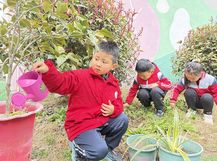 在老師的安全指導(dǎo)與分工協(xié)作下,養(yǎng)護行動正式開始。有的孩子輕輕拔除雜草、用小耙子疏松表土;有的孩子手持小鏟,為綠植根部細心填土、培土固根;有的孩子學(xué)習(xí)科學(xué)施肥,將肥料均勻撒在根系周圍,再覆蓋薄土鎖住養(yǎng)分。大家分工明確、配合默契,小手雖稚嫩,動作卻專注認真,校園綠化帶里處處是忙碌而有序的身影,泥土的清香與孩子們的歡聲笑語交織成春日最美的風景。